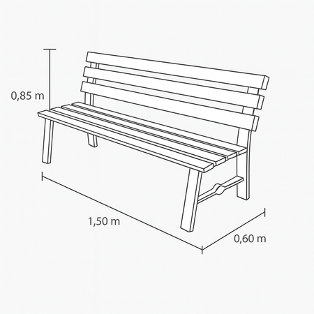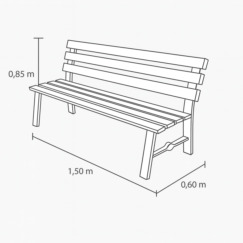 La base y los soportes están fabricados en acero estructural galvanizado, mientras que el asiento y respaldo están compuestos por lamas de plastimadera sintética color madera natural, un material resistente al sol, la humedad y la corrosión, que no requiere mantenimiento.