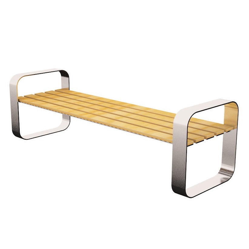 Las bases laterales están fabricadas en acero estructural doblado en una sola pieza, lo que garantiza una gran estabilidad y aporta una apariencia moderna y robusta. El asiento está conformado por lamas de plastimadera color madera natural, resistentes a la intemperie, la humedad y los rayos UV, sin necesidad de mantenimiento.