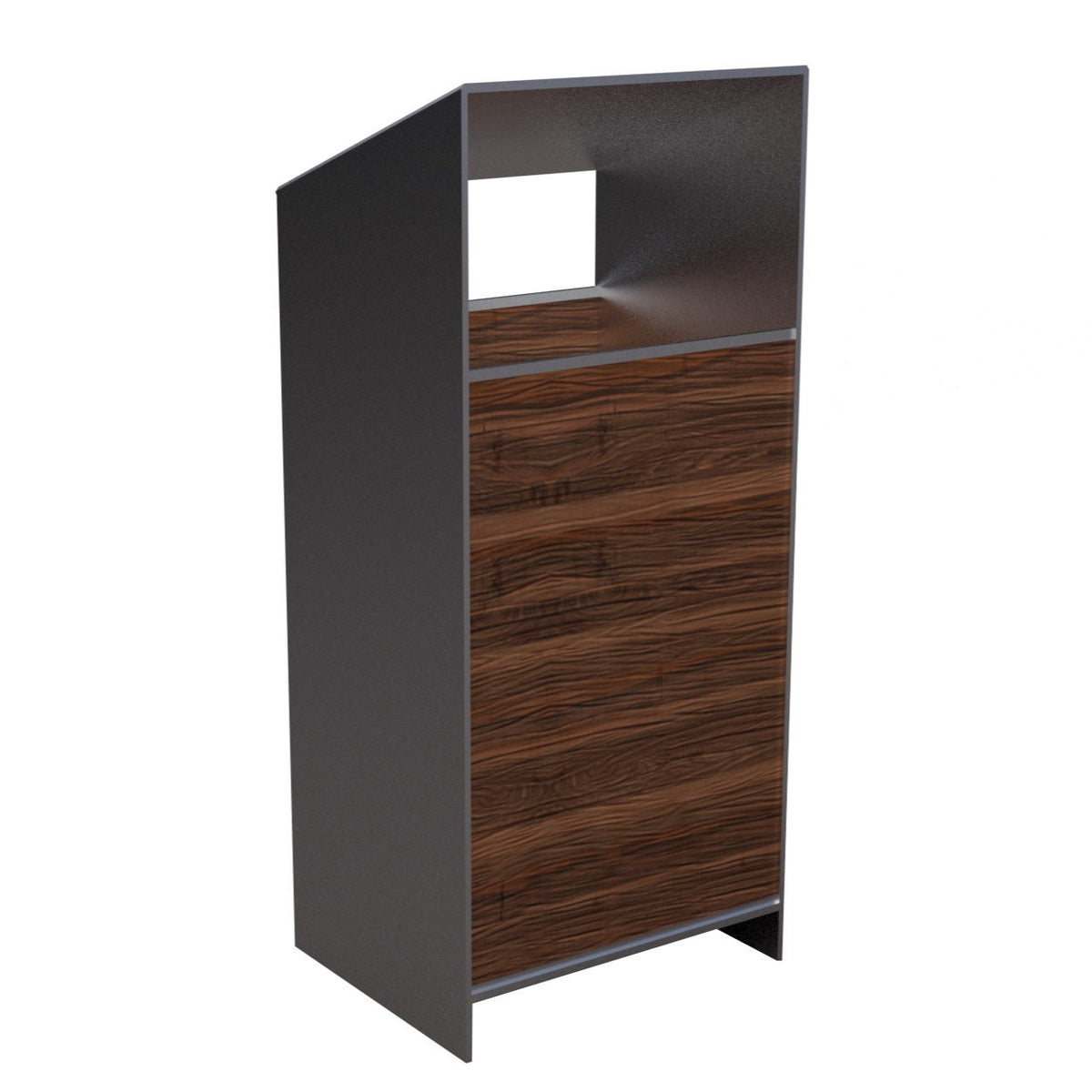 Su diseño incorpora una apertura frontal elevada que facilita el depósito de residuos sin contacto directo, además de una puerta abatible o desmontable para el retiro del contenedor interno. Este modelo está diseñado para integrarse armónicamente con mobiliario urbano contemporáneo, aportando limpieza visual y funcionalidad.
