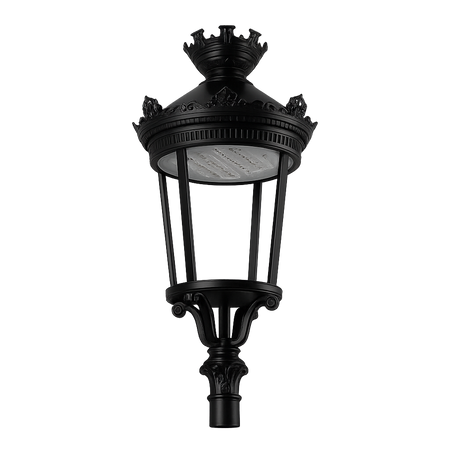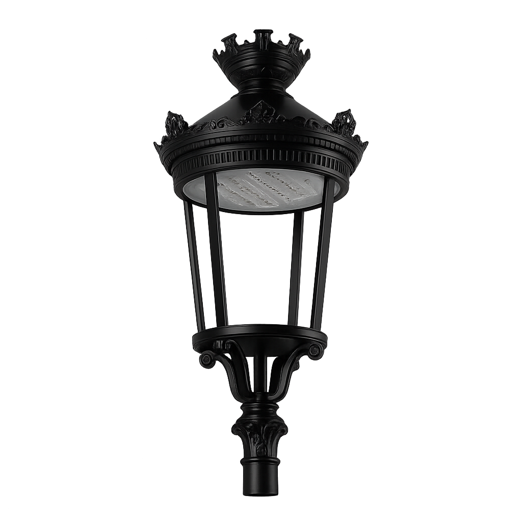 Luminaria LED para punta de poste con diseño colonial, ideal para espacios urbanos donde se busca integrar un estilo clásico que armonice con la arquitectura circundante. Fabricada con driver electrónico de tensión universal (127–277V) y óptica de PMMA de alta transmitancia, ofrece una distribución uniforme de luz con atenuación 0–10V y un flujo luminoso de hasta 7,700 lm.