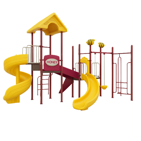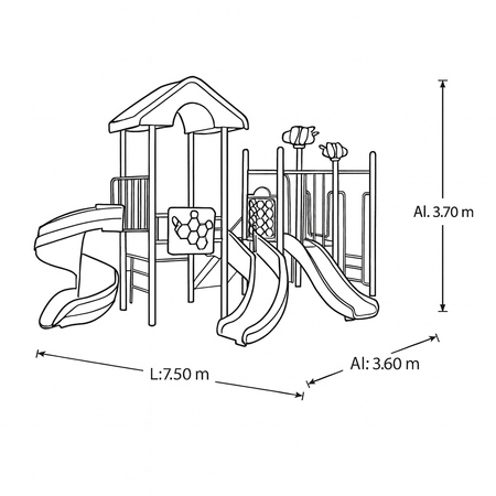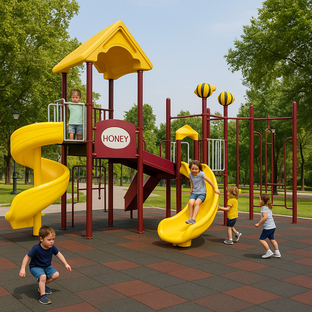 Inspirado en formas suaves y amigables, el modelo incluye toboganes curvos, rampas, túneles y figuras decorativas tipo abejas, fomentando el juego activo y el desarrollo motriz infantil.