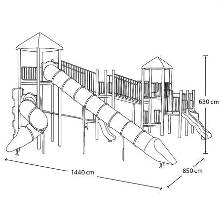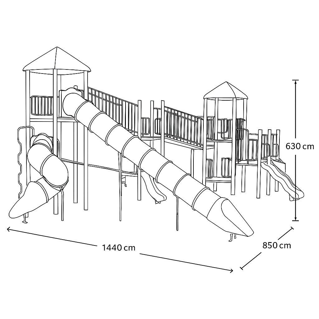 El Castillo Imperial TM50P es una estructura monumental de recreación infantil, diseñada para parques y espacios públicos de gran afluencia. Combina materiales metálicos de alta resistencia con accesorios plásticos de primera calidad, ofreciendo una experiencia segura, dinámica y visualmente impactante. Su diseño modular y sus múltiples torres conectadas fomentan la exploración, el juego grupal y la actividad física en niños de diversas edades.