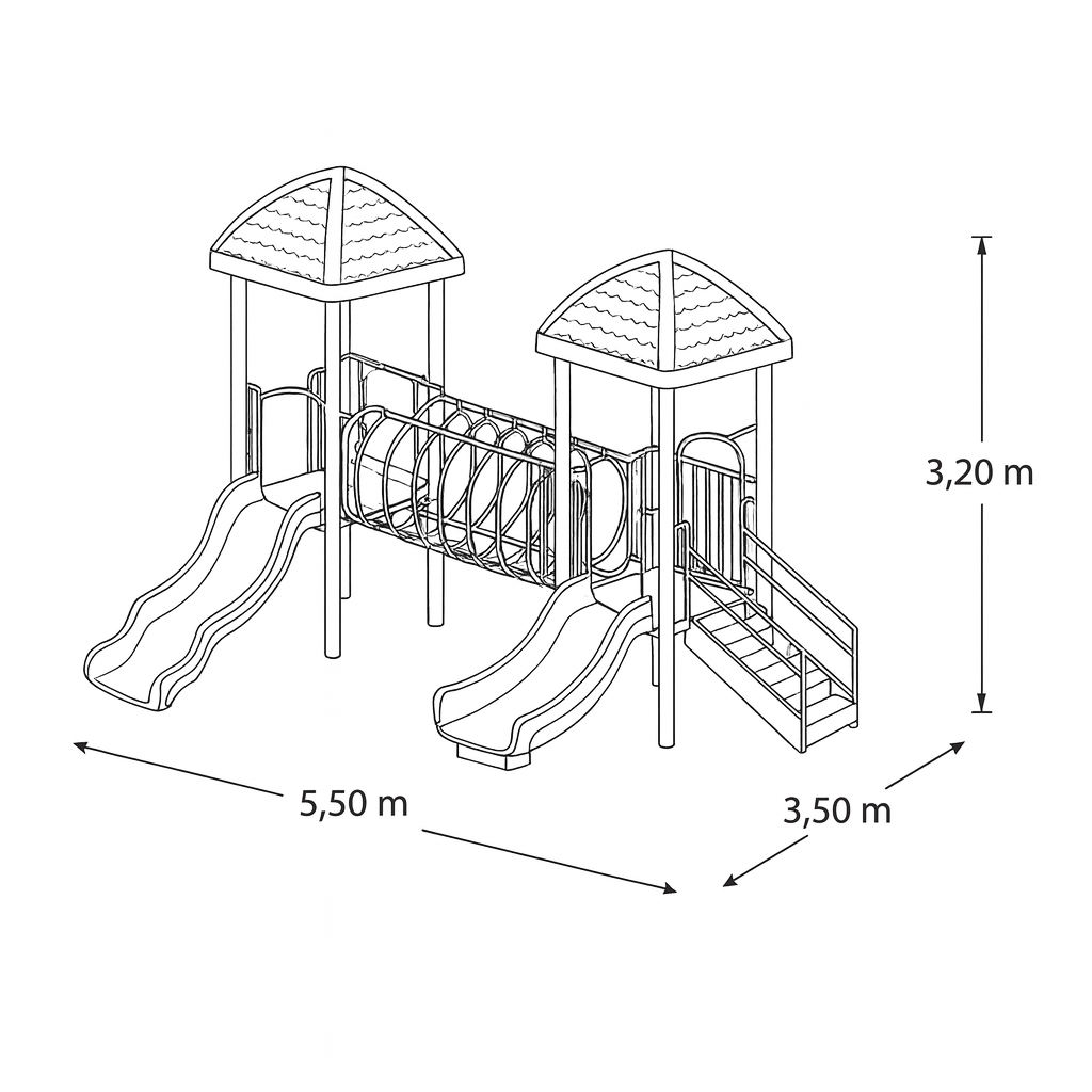 Este modelo cuenta con toboganes dobles, túneles circulares, escaleras amplias y pasamanos tubulares, favoreciendo el desarrollo motriz y la interacción entre los niños.