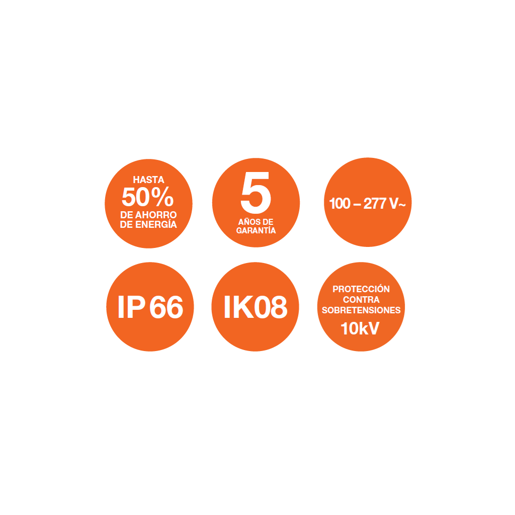 Todos los modelos cuentan con protección IP66 contra polvo y agua, grado de resistencia IK08 ante impactos, protección contra sobretensiones de 10 kV y alimentación de 100-277 V. Cuenta con garantía de 5 años.