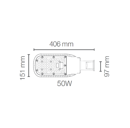 Potencia de 50 W, flujo luminoso de 5,000 lm, temperatura de color de 6500 K con IRC >80 y vida útil de 50,000 h. Ángulo de apertura con curva tipo II media. Dimensiones: 406 × 151 × 97 mm.