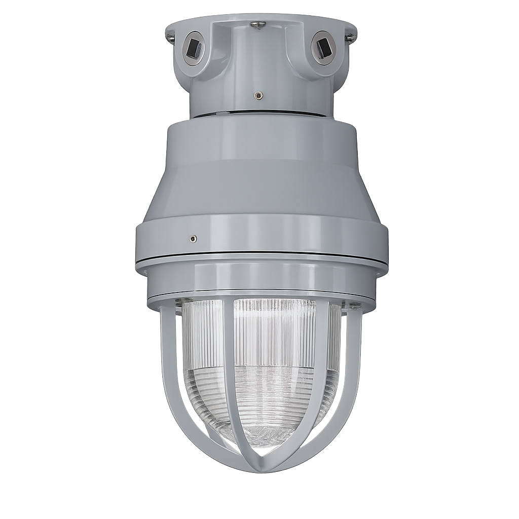 La luminaria industrial LED retrofit a prueba de explosión Serie LE-LED-RT de RAWELT, en montaje a techo con conduit de 25.4mm, identificada con el código de catálogo LET-3-LED-2-RT, está diseñada para proporcionar iluminación segura, eficiente y confiable en entornos industriales clasificados. Su diseño cerrado, sellado y a prueba de explosión permite su operación en áreas donde existe presencia de vapores inflamables, gases combustibles o polvos explosivos, tanto en aplicaciones interiores como exteriores.