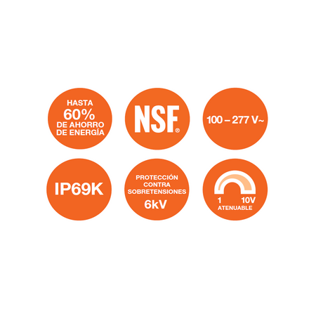 Cuenta con certificación NSF (National Sanitation Foundation), lo que la convierte en la opción ideal para cocinas industriales, comisariatos, procesadoras de alimentos y almacenes fríos, cumpliendo con los más altos estándares sanitarios del sector.