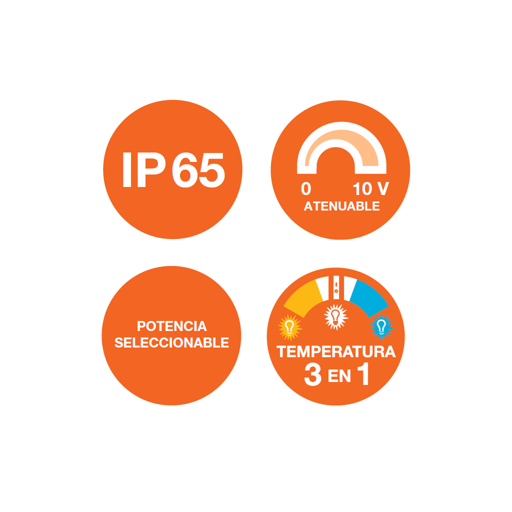 Cuenta con potencia y temperatura de color seleccionables mediante un práctico switch que permite adaptar el rendimiento lumínico a las condiciones específicas del espacio. Además, puede integrar un sensor infrarrojo programable (accesorio opcional) para un control remoto más avanzado.