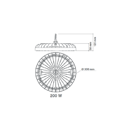 Potencia de 200 W, flujo luminoso de 26,000 lm, temperatura de color 6500 K, IRC >80, vida útil de 30,000 horas y dimensiones  300 x 50 mm.