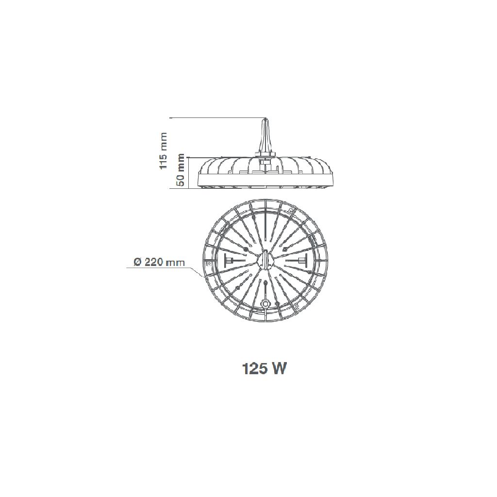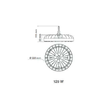 Potencia de 125 W, flujo luminoso de 16,250 lm, temperatura de color 6500 K, IRC >80, vida útil de 30,000 horas y dimensiones Ø 220 x 50 mm.
