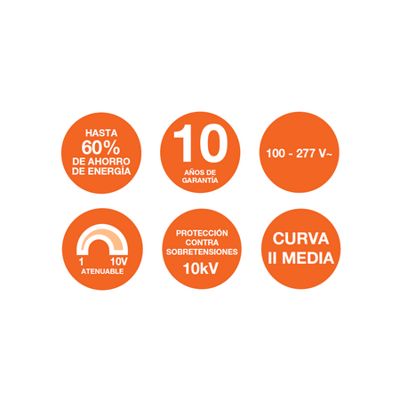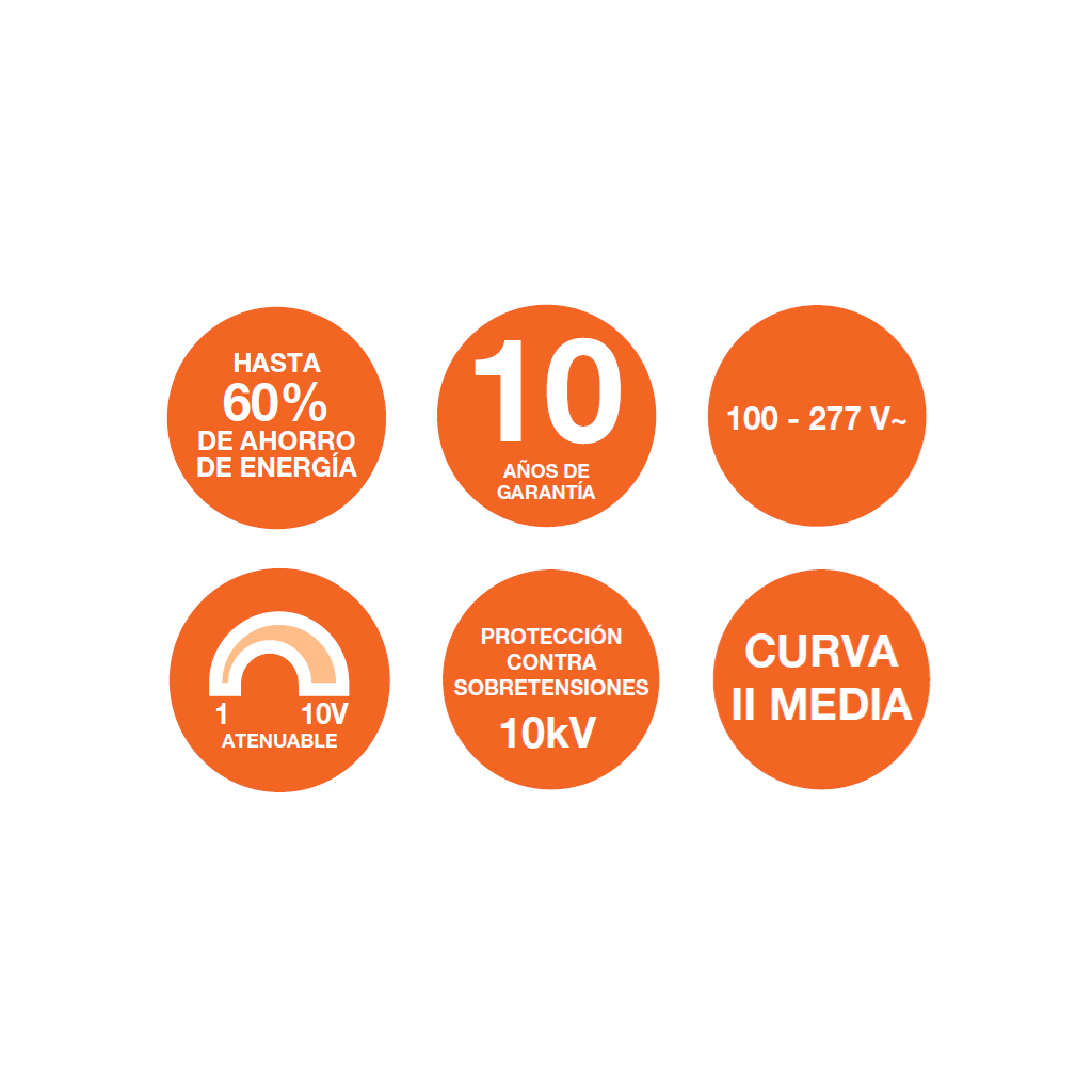 Luminaria LED con receptáculo de siete pines para sustitución de equipos tradicionales de aditivos metálicos, cerámicos o vapor de sodio en alta presión, logrando hasta un 70% de ahorro en el consumo de energía eléctrica. Esta nueva generación incorpora LEDs de alto rendimiento que garantizan un flujo luminoso de 80% a lo largo de 100,000 horas de funcionamiento, lo que se traduce en una disminución de gastos operativos y de mantenimiento.