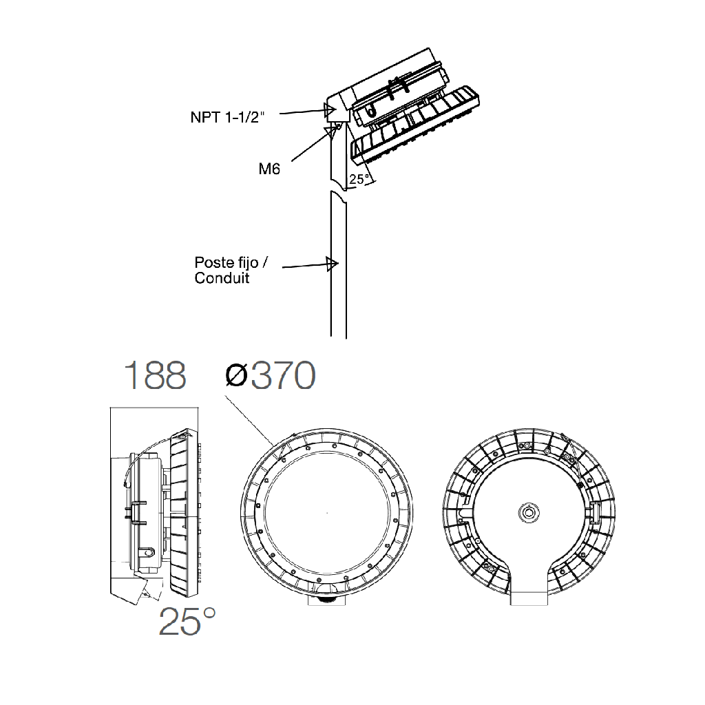 Fabricadas con cuerpo sellado resistente a la corrosión y al impacto, estas luminarias ofrecen protección NEMA 4X, clasificación térmica T4 @ 55 °C, certificación HazLoc y tecnología atenuable por protocolo 0-10 V. La vida útil es de 100,000 horas L70 y todas las versiones superan las 1,000 horas de prueba en niebla salina. El montaje es por rosca NPT de 1½”.