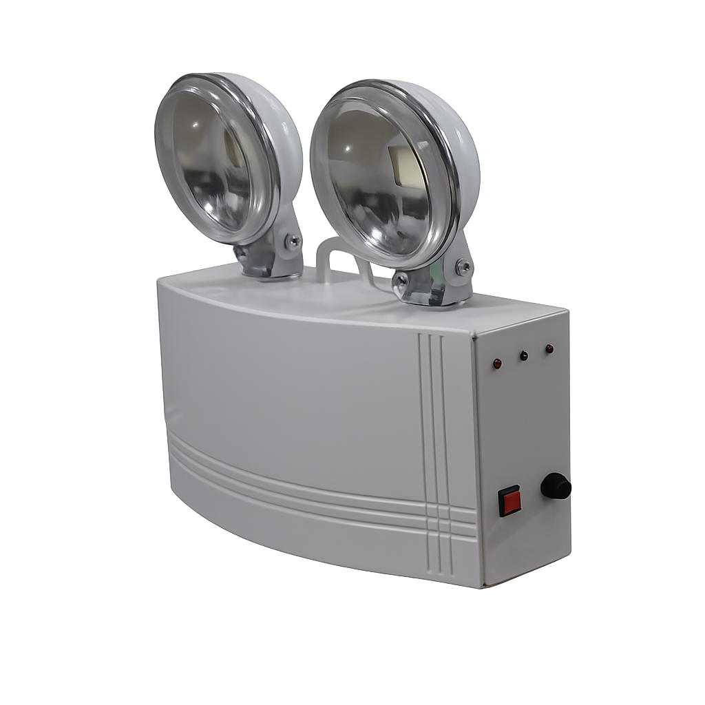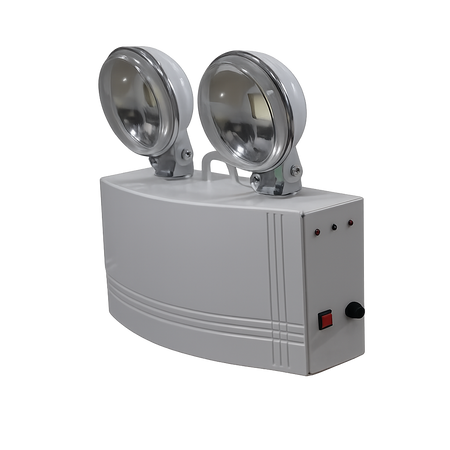 Fabricada con cuerpo de acero y componentes de policarbonato, esta luminaria integra dos spots LED dirigibles de alta salida, permitiendo orientar la luz hacia zonas específicas para una señalización efectiva. Incorpora botón de prueba para verificación de funcionamiento y un sistema de respaldo mediante batería recargable Ni-MH, asegurando operación autónoma en situaciones de emergencia.