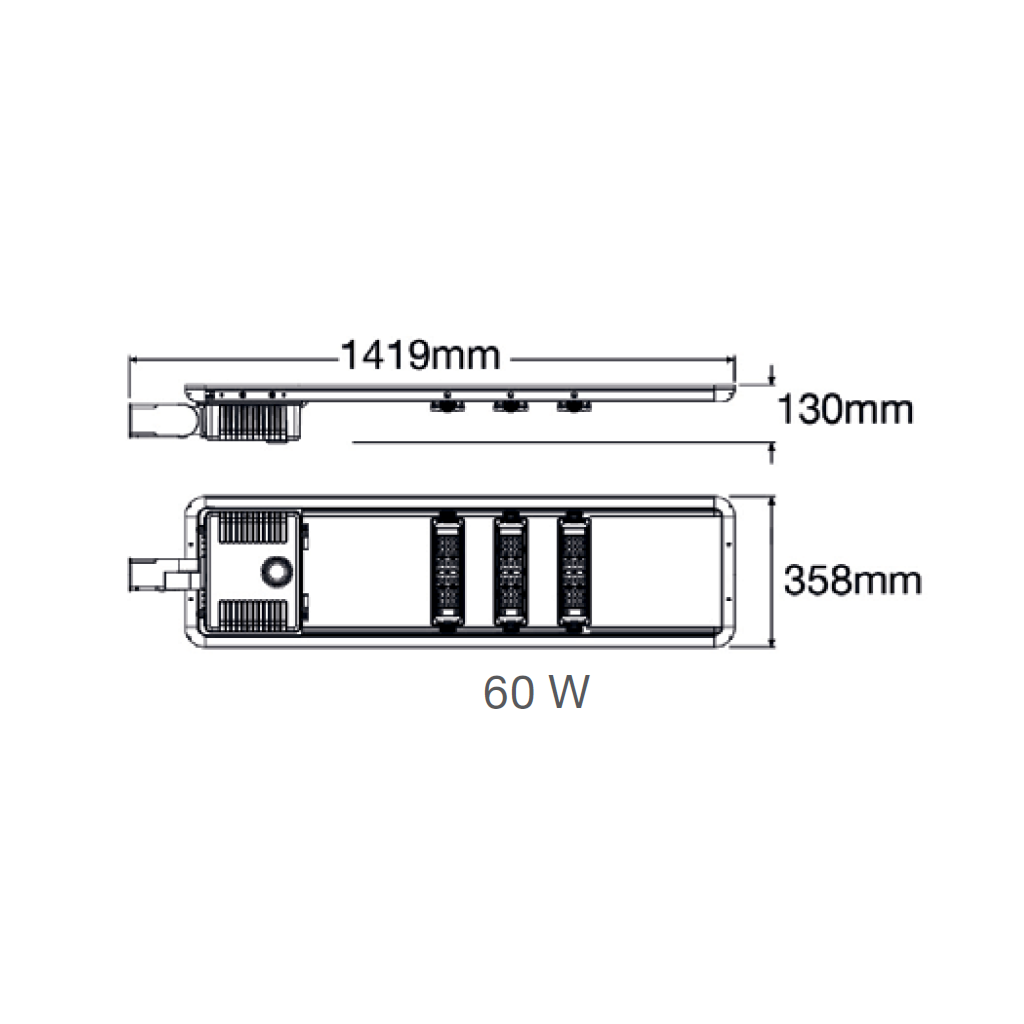 Equivalente a 120 W AM, flujo luminoso de 11,100 lm, temperatura de color 5000 K, IRC >70, ángulo de apertura 150° × 100°, vida útil de 60,000 h, dimensiones 1419 × 358 × 130 mm, color negro.