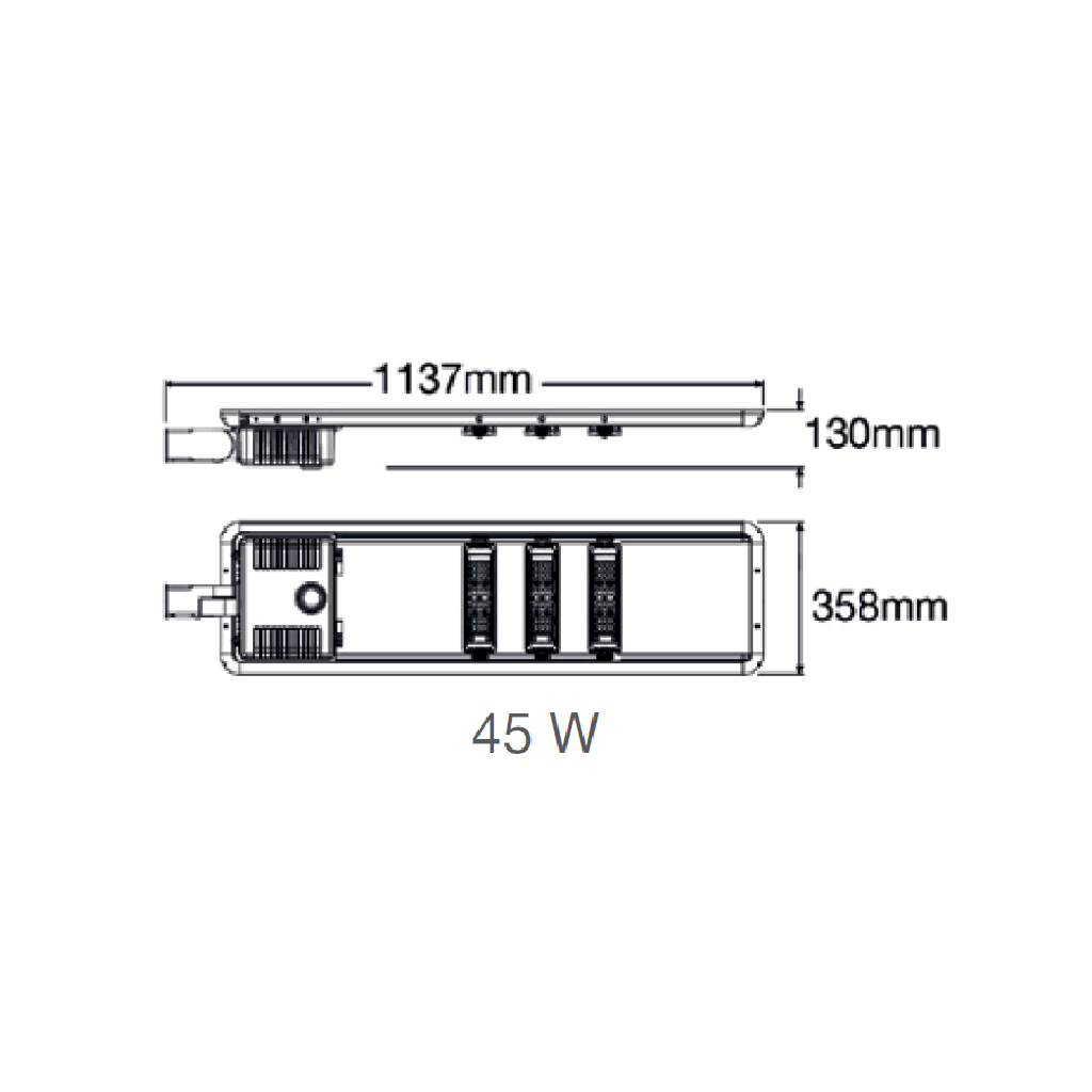 Equivalente a 100 W AM, flujo luminoso de 8,325 lm, temperatura de color 5000 K, IRC >70, ángulo de apertura 150° × 100°, vida útil de 60,000 h, dimensiones 1137 × 358 × 130 mm, color negro.