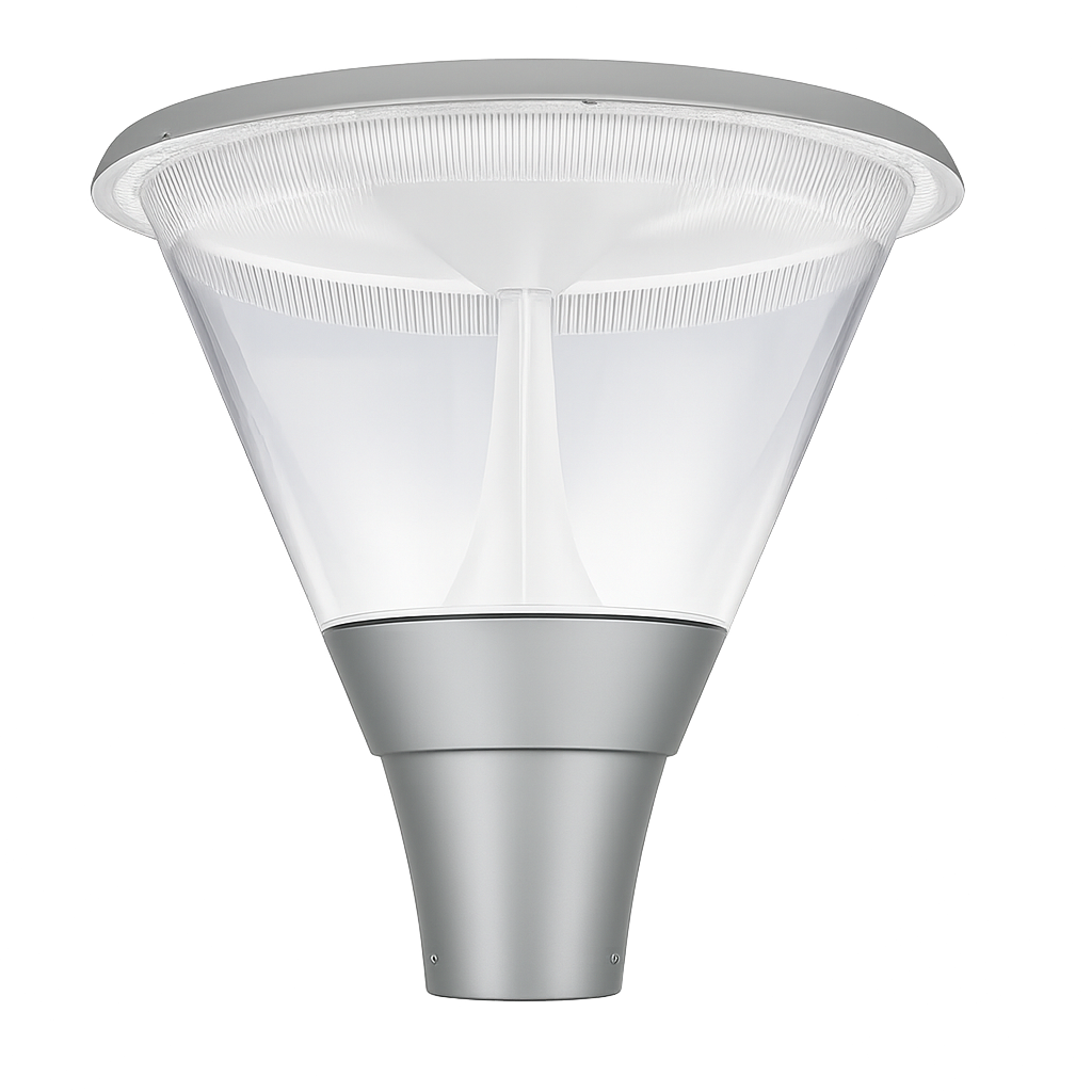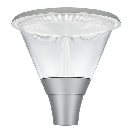 El luminario Corvus es un modelo para instalación en punta de poste que destaca por su diseño óptico especial, ofreciendo iluminación indirecta y un alto confort visual. Su fuente luminosa está ubicada en la base y, gracias a una pantalla reflectiva, proyecta una luz suave y uniforme que proporciona seguridad y confort en espacios exteriores.