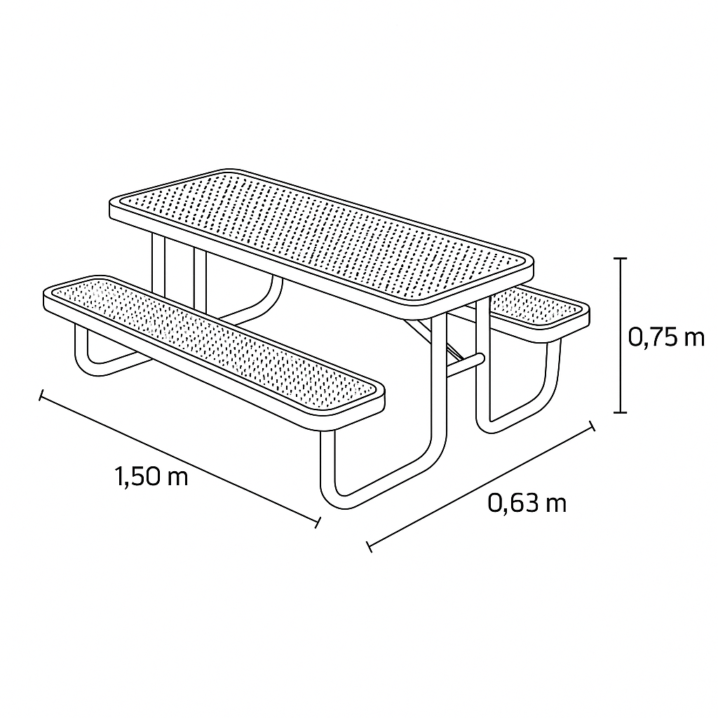 El tablero y los asientos cuentan con una superficie perforada que mejora la ventilación y evita la acumulación de agua, manteniéndose funcional incluso bajo exposición directa al clima. Su estructura tubular ofrece una excelente resistencia estructural sin sacrificar ligereza visual, logrando un equilibrio entre diseño y practicidad.