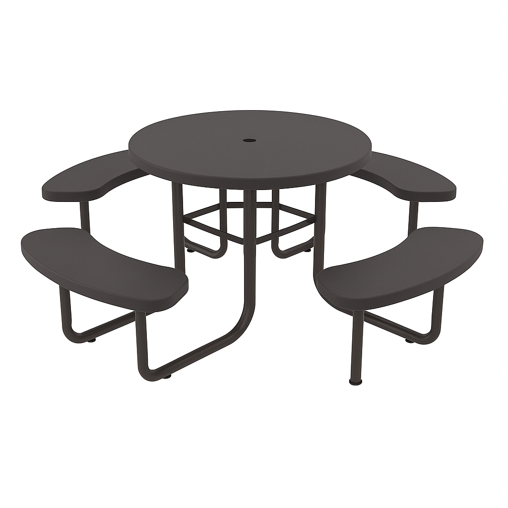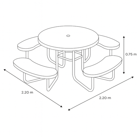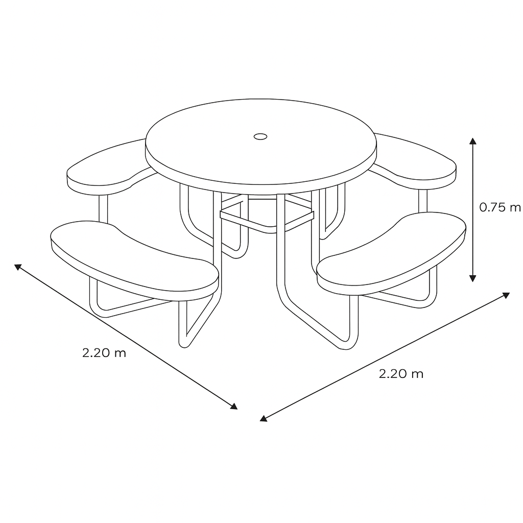 La Mesa Picnic 08 JIMPIC-08 es una pieza de mobiliario urbano diseñada para fomentar la convivencia y el uso eficiente del espacio. Su estructura circular con bancos curvos integrados permite un acceso cómodo desde cualquier ángulo, siendo ideal para parques, jardines, comedores al aire libre, escuelas y áreas recreativas de alta afluencia.