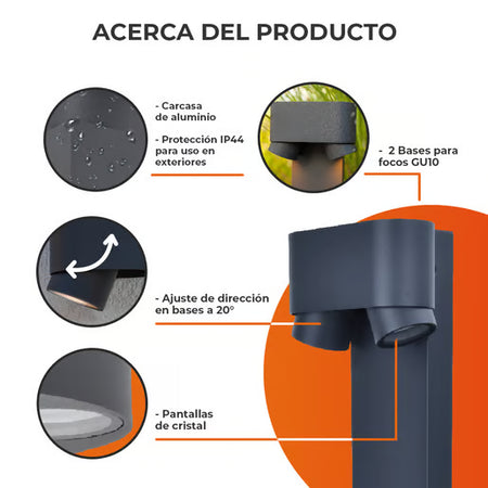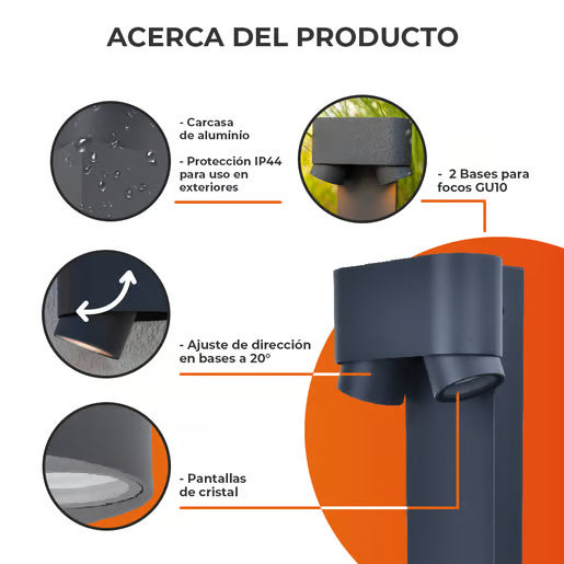 Equipa dos bases GU10 dirigibles, permitiendo ajustar la dirección de la luz para destacar senderos, muros o vegetación. Admite lámparas LED de hasta 12 W (no incluidas), ofreciendo flexibilidad en potencia, temperatura de color y ángulo de haz. Su sistema de iluminación inferior reduce el deslumbramiento y mejora el confort visual.