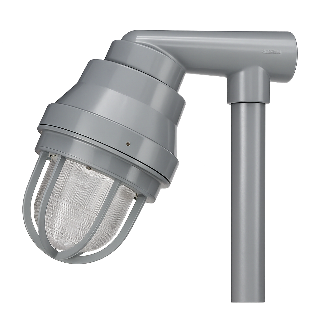 Este portalámparas puede utilizarse tanto en ambientes generales u ordinarios como en zonas clasificadas, conforme a lo establecido en el NEC (National Electrical Code). La configuración de montaje a poste con inclinación de 25° permite dirigir la iluminación de forma controlada, siendo ideal para vialidades internas, perímetros, áreas de proceso y zonas de tránsito dentro de instalaciones industriales.