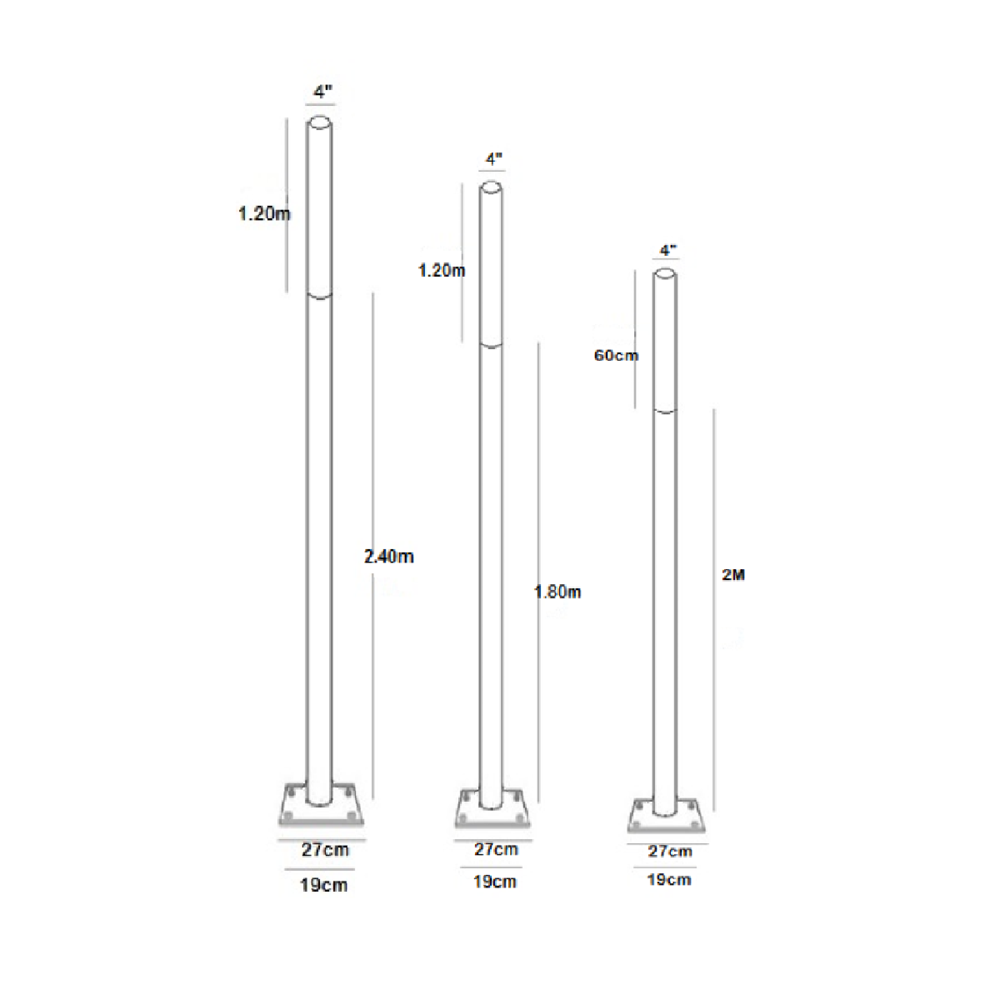 Poste de luz tipo bolardo cerillo de 3.60 m, una opción versátil para proyectos urbanos y arquitectónicos que requieren mayor alcance lumínico. Fabricado con tubo de acero calibre 18 de 4” de diámetro exterior, ofrece gran estabilidad y durabilidad ante condiciones ambientales exigentes.