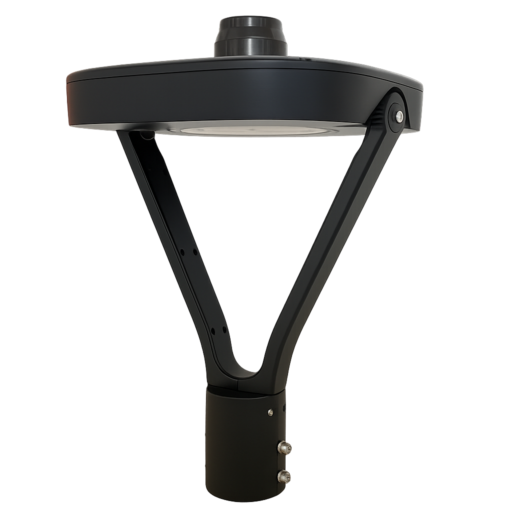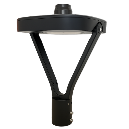 Luminario de LED tipo punta de poste con sistema switchable, ideal para iluminación decorativa y eficiente en exteriores urbanos.