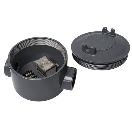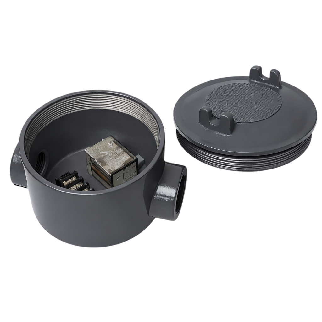 Fabricado con cuerpo de aluminio inyectado a presión, el relevador ofrece una estructura robusta y de alta resistencia mecánica, con un diseño sellado que protege los componentes internos. Está diseñado para instalación mediante entrada tipo hub y es compatible exclusivamente con luminarias dobles LOD de la Serie LO-PC.